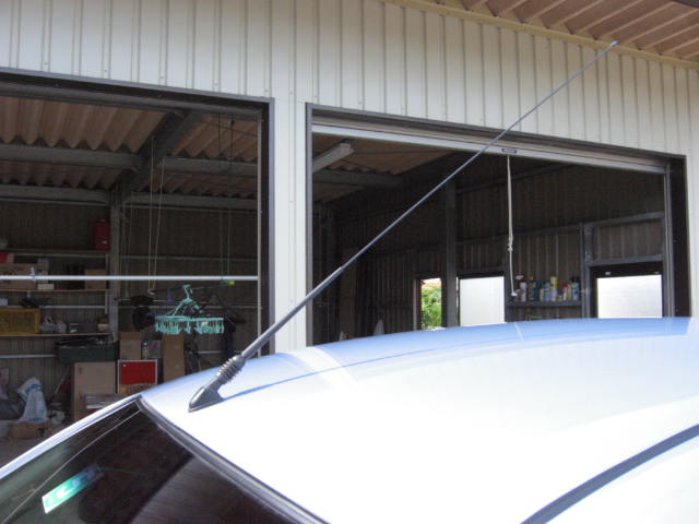 今時の車のアンテナ。ぶつかりそうな時はノーマルでは外さなきゃいけないですけど、ジョイントが付いていると根本から曲げられます。ショートアンテナは受信感度が悪いらしいです。 |