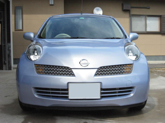 マーチを正面から捉えたところです。正面から見ると目がまん丸でかわいいんですよ。フロントですけど、以外と最低地上高が低いです。車輪止めはかなりの確率でヒットしそうです。 |