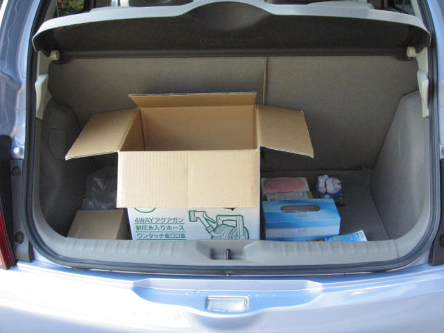 ちょっと狭いトランク。けど、これでだいたいの物は詰めますよ。ドラえもんとか花粉対策ティシューとか、ホースの箱とか♪ぎりぎりゴルフバックが1つはいるらしいですけど、真意の方は…。 |