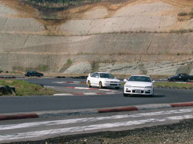インプレッサはいつもどおり、前に行かせてから後ろから攻める戦法。(^^ゞ というか、やっぱり、後ろに同じくらいのラップタイムで走る車がいると走りづらいものですからね。先に行かせるのが一番です。ただ、インプレッサとは時々くっつくが離れはしない。う〜ん、微妙な関係。