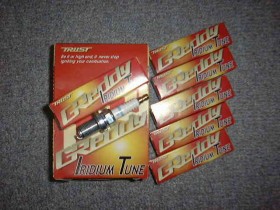 ECU交換で、ブーストアップしたのでプラグを購入しました。HKSは、DENSOのものを使っていて、TRUSTの方はNGKを使っています。NGKにもイリジウムを使ったプラグはありますが、そちらの方はちょっと割高なのでTRUSTの物にしました。熱価は、今の状態では7番くらいがちょうど良いと思うのですが、後々のことを考えて8番にしておきました。取り付けはそのうち行います。 |