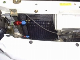 日光サーキットでの走行会に備えて購入した物です。TRUSTとHKSで散々迷ったのですが、TRUSTは車種専用設定がなく(付く事は付く)、結局HKSにしました。オイルクーラーの効果はすさまじい物であり、今までは巡航している時や街乗りの時、要するに普通に走っている時は油温が90℃だったものが80℃へ。また、最高気温が25℃もあった日光サーキットですら油温は110℃以上にはなりませんでした。できることなら純正インタークーラーがある所かその逆のところに取り付けたかったのですが、それは仕方ありませんね。取り付けは自分で行いましたが難しい事はありませんでした。簡単に言うとフロントバンパーを外し、オイルクーラーを取り付けて元に戻し、オイルを大体1Lくらい足すだけでOKです。必要な工具としては25mmのスパナ(メガネとかソケットは×)と、オイルフィルターを取り外しできる物くらいです。ただ、単純な作業の割に、フロントバンパーを外すのにかなり手間取ります。 | |