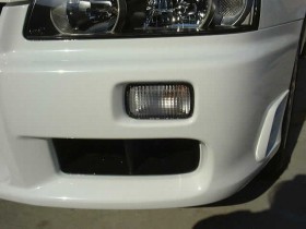 ついでに装着してしまったパーツです。フルスポイラーも考えたのですが、以外とノーマルのデザインが好きなのと、凄く興味を引かれるスポイラーが無かったのでHASEMIのリップスポイラーにしました。このスポイラー、左右のダクトの黒い部分に被さっているのですが、同じ白でそこに被せると個人的に格好悪いと思うので塗り分けてもらいました。かなり目立ちません。詳細はHASEMIのホームページを見てください。形状的にほんの少しのダウンフォースが得られそうなので機能的にも良いかも知れません。 装着時にフロントバンパーを傷つけられたようです。タッチアップで補修してありました。(T.T) |