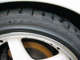 高級タイヤのRE-01のフロントです。もちろん2本組み。購入は実家近くの個人経営のタイヤショップでしたが、近くのオートバックスよりは安い値段で購入することが出来ました。ただ、FM901と比べると、前後セット&組み込み&バランス取り工賃の合計が3万円以上違いました。これが高級タイヤたる所以ですな。簡単なインプレは下に書いておきます。 |