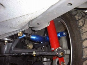 日産のマルチリンク車は車高を下げるとリヤのネガティブキャンバー?がつきすぎてしまい、トラクション不足になるので、これを付けてキャンバー角を調整します。また、ピロボールを使用しているので、若干不要な動きを抑制できるようです。効果の程はアライメント調整と同時に行ったのでよく解りません。 | |